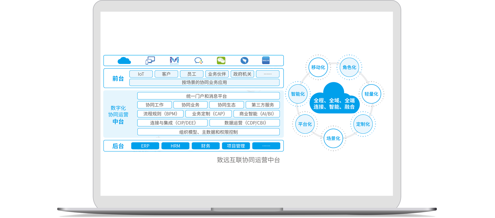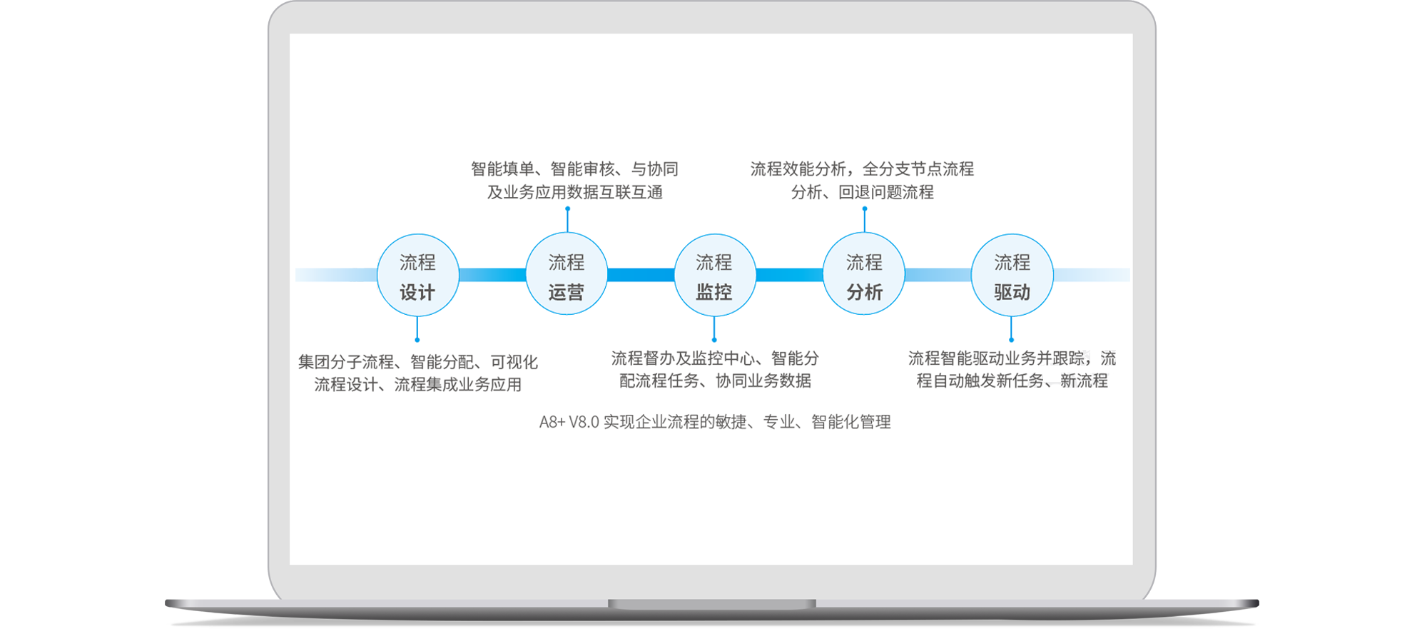 致遠互聯A8+ V8.0新一代智慧型協同運營平臺以中臺的架構和技術、協同、業務、連接、數據的分析能力,夯實協同運營中臺的落地效果;以移動化、AI智能推進前臺的應用創新,實現企業輕量化、智能化業務場景,促進企業全過程管理能效,賦予企業協同工作和運營管理的新體驗;在協同運營平臺升級的基礎上,V8.0深耕大型企業管理模式、運營機制,進一步強化“協同”在管理中的價值,推動大中型企業、集團企業、國資以及企業的管理模式升級,幫助企業構筑全程、全域、全端的運營和服務能力,提升人員效率和組織績效,賦能企業數字化、智能化發展。