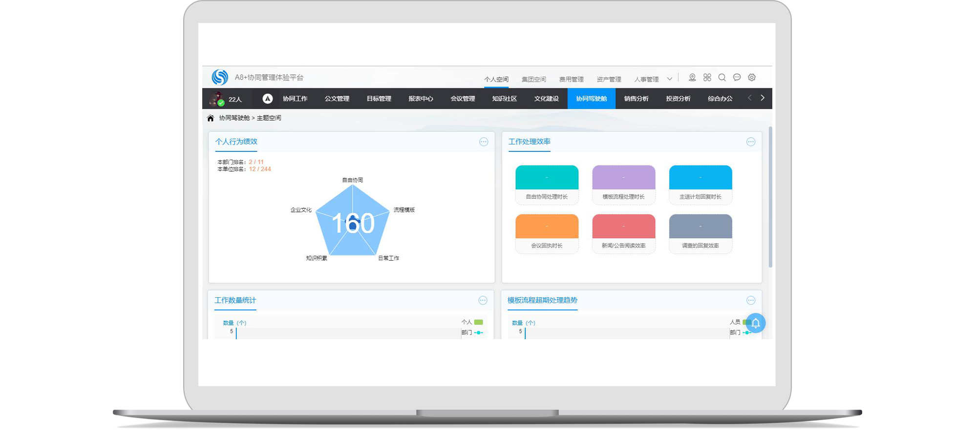 支持呈現個人行為績效、工作處理效率、協同360、模板流程超期處理趨勢。支持呈現數據總覽,流程效率,節點效率,部門效率,人員效率等不同維度的流程效率圖表。支持呈現組織行為績效分,可對部門、人員等不同層級進行行為績效排名。支持呈現存儲空間統計,在線時間分析,在線人數趨勢,協同立方。
