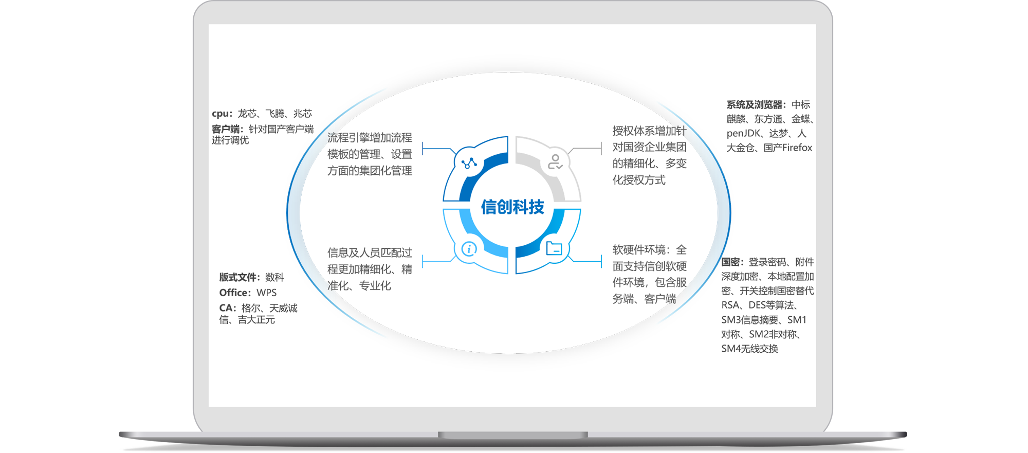 針對國資、央企等普遍的信創需求,致遠互聯加強了對信創技術的支撐能力,支持CPU、操作系統、數據庫、服務器、中間件等信創的軟硬件環境;在部署運維和安全方面,A8+ V8.0 提供統一服務啟停配置、消息通知、補丁包自動更新、年度運維服務報告等技術能力,讓平臺的日常運行維護響應更及時、安全更可靠。