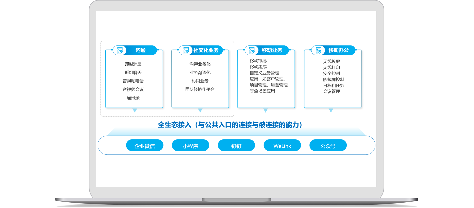 致遠互聯不僅能夠通過協同云生態實現企業內外部的業務連接和機會尋找,還能通過微協同引擎,連接企業微信、釘釘、WeLink 等其他企業生態,與外部企業進行業務連通和服務。致遠互聯微協同為企業移動辦公帶來便捷、安全、 統一的入口,實現企業“連接一切與被一切連接”的全生態協同能力。