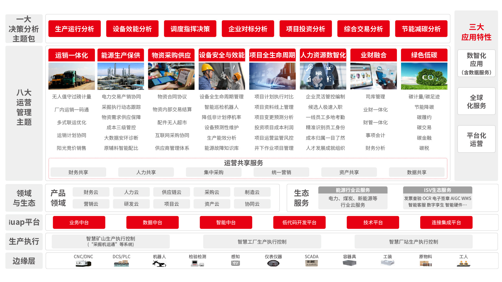 全球能源轉型的趨勢是推動能源結構向低碳化、清潔化、終端能源電氣化發展,而數智化技術在此過程中將發揮無可替代的作用。在能源企業數智化轉型過程中,以“綠色網絡,數智驅動”為理念,打通企業內外部,構筑橫向到邊組織業務協同關系,優化產業上下游,建立縱向到端的產品供需協同關系。將能源產供銷通路與行業戰略發展目標相結合,達成“雙碳”戰略目標,提升企業運營、數據運營、產業鏈運營的綜合能力。