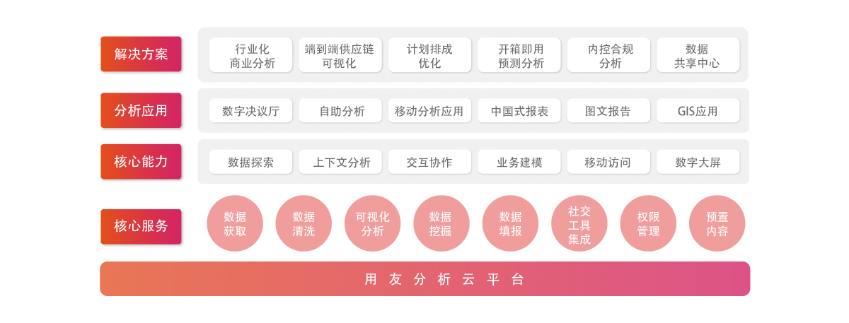 面向行業運營分析場景的全分析服務解決方案;采用大數據、云計算等先進技術;同時支持私有化部署和公有云部署