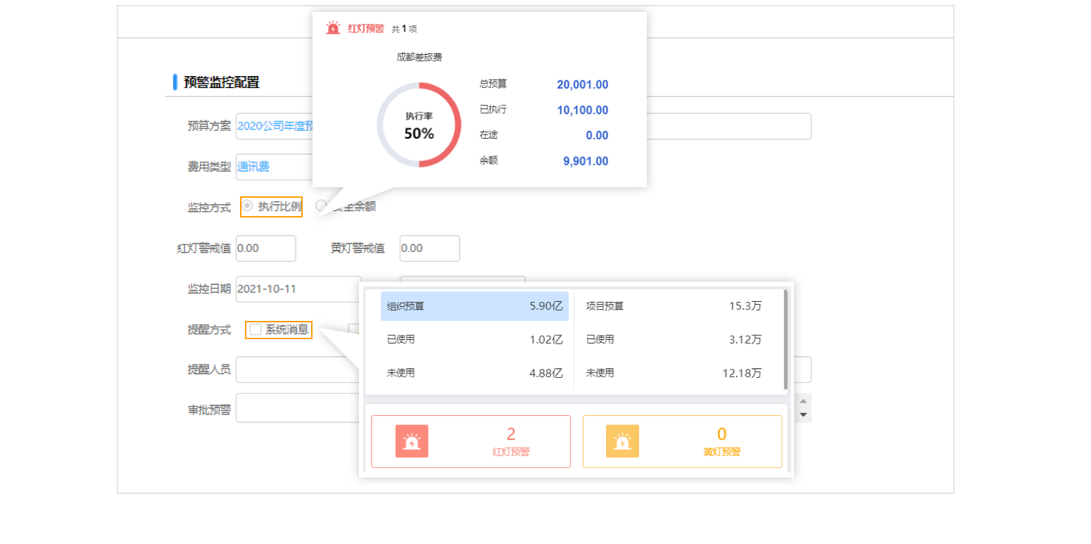 預(yù)算預(yù)警可以指定在某個時間段內(nèi),對預(yù)算方案下的某一費用類型自定義安全余額或執(zhí)行比例,在業(yè)務(wù)審批過程中達(dá)到這個安全邊界值時,就會有提示信息,并且在預(yù)警看板中也會顯示出來。 預(yù)警的程度分為紅燈預(yù)警和黃燈預(yù)警,可以分別定義不同的安全余額或執(zhí)行比例。