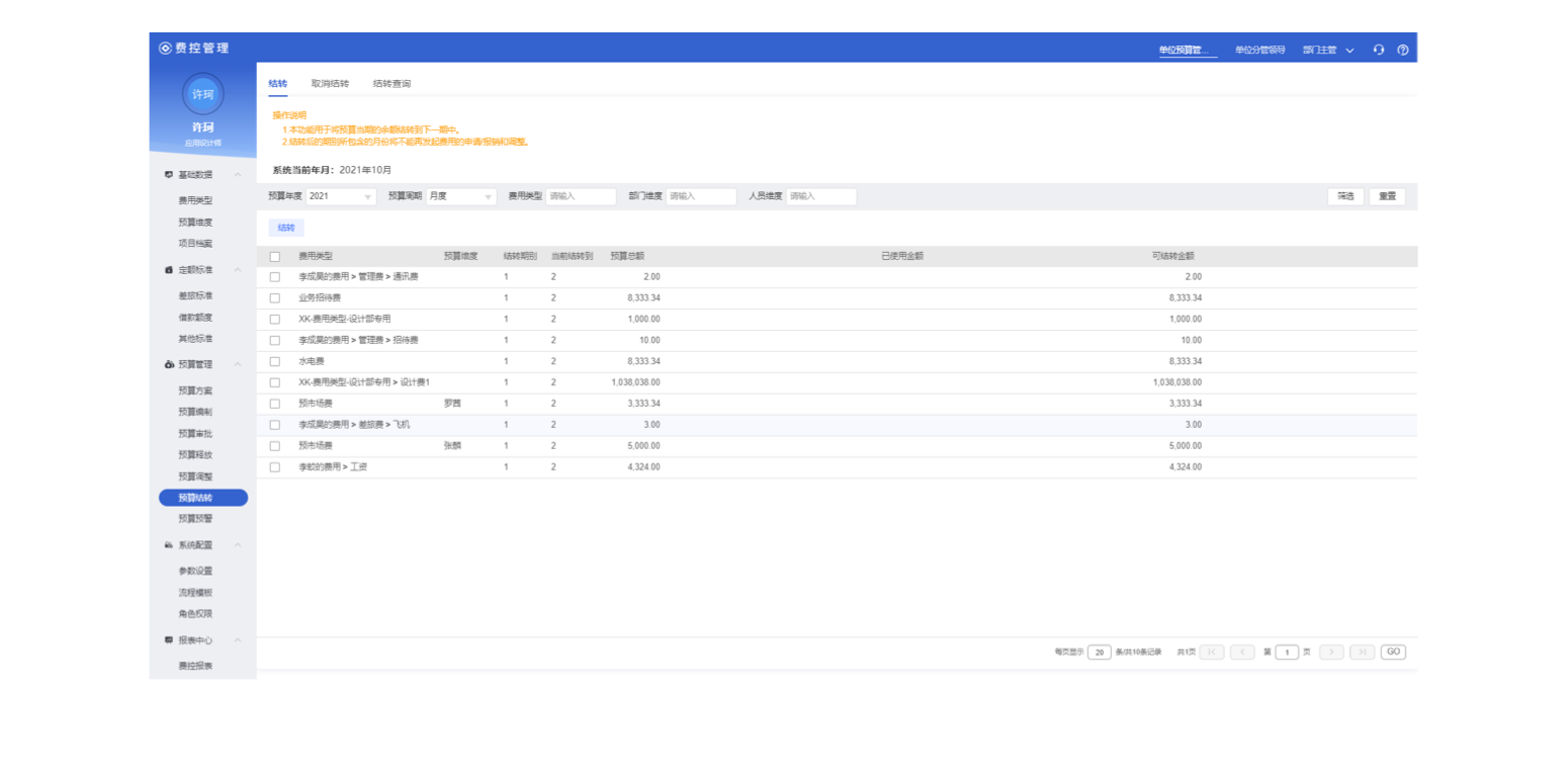支持企事業(yè)單位按不同費用類型,在當(dāng)前預(yù)算額沒有花完時,在指定的期末可以將可用余額結(jié)轉(zhuǎn)到下一期,用于在預(yù)算期間控制使用情況,強化預(yù)算控制。