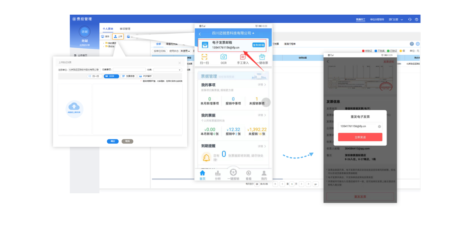 票據(jù)管理子模塊包括掃一掃、OCR識別、手工錄入發(fā)票信息、電子發(fā)票PDF、OFD 解析方式上傳票據(jù),可實現(xiàn)企業(yè)票據(jù)的統(tǒng)一管理。移動端支持一鍵收票(微信、支付寶、攜程、京東、滴滴、南航、高速公路收費服務(wù))、發(fā)票拍照上傳,方便操作。 票據(jù)管理與稅務(wù)系統(tǒng)打通,實現(xiàn)電子發(fā)票的驗真驗重,及其他票據(jù)的驗重,納稅人識別號的校驗。支持發(fā)票共享、實現(xiàn)本人上傳,他人報銷,方便多人的報銷業(yè)務(wù)處理,不支持Excel 導(dǎo)入發(fā)票。業(yè)務(wù)包含票據(jù)上傳錄入、查詢過濾、分類共享、票據(jù)查看、發(fā)票驗證、回收刪除、關(guān)聯(lián)協(xié)同、一鍵報銷、 自定義分類等功能。