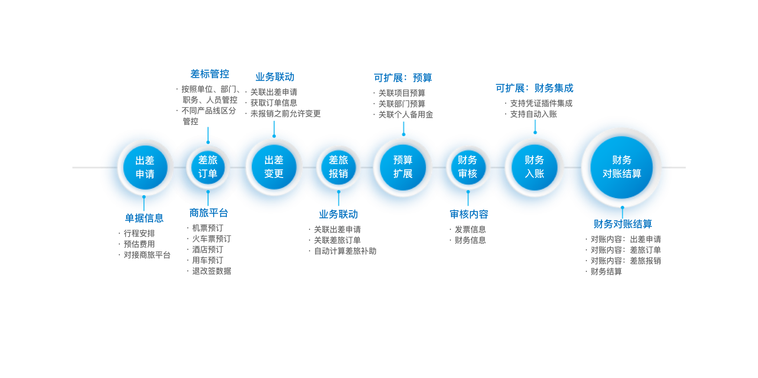 商旅業(yè)務(wù)子模塊采用出差申請與報銷業(yè)務(wù)與商旅平臺【差旅天下】深度整合,讓員工操作無感自動化切換,實現(xiàn)從出差申請、商旅預(yù)訂、行程退改簽、差旅費報銷、商旅對賬等功能,實現(xiàn)員工出差業(yè)務(wù)全程電子化、無現(xiàn)金交易,自動化控制不同職級人員差旅標(biāo)準(zhǔn)的有效執(zhí)行,提高員工滿意度,降低審計內(nèi)控風(fēng)險。