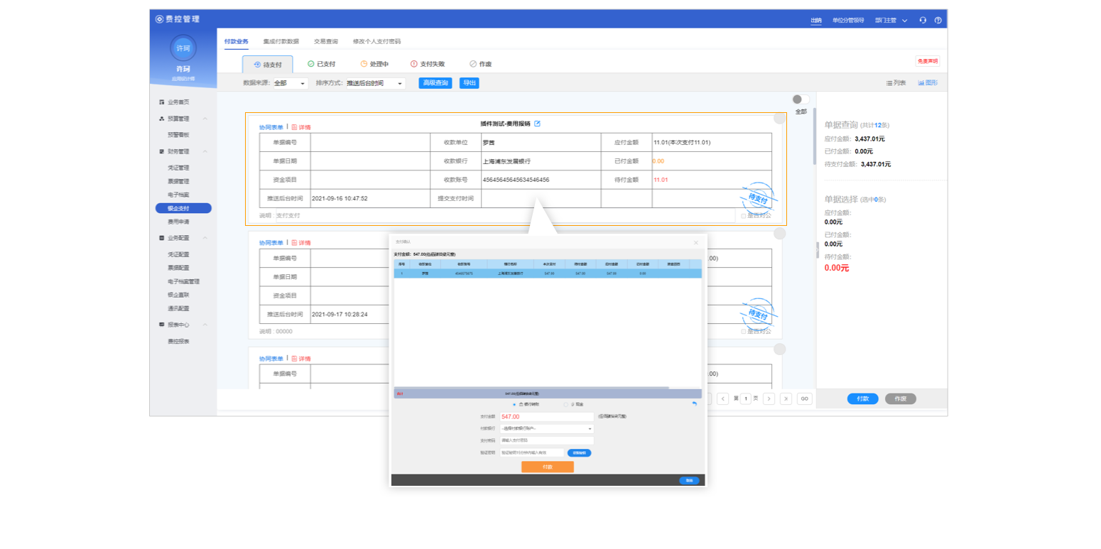 系統(tǒng)預(yù)置銀企直連模塊,支持一鍵快速支付和付款池批量支付兩種支付方式,以便于企事業(yè)單位對資金的合理使用;