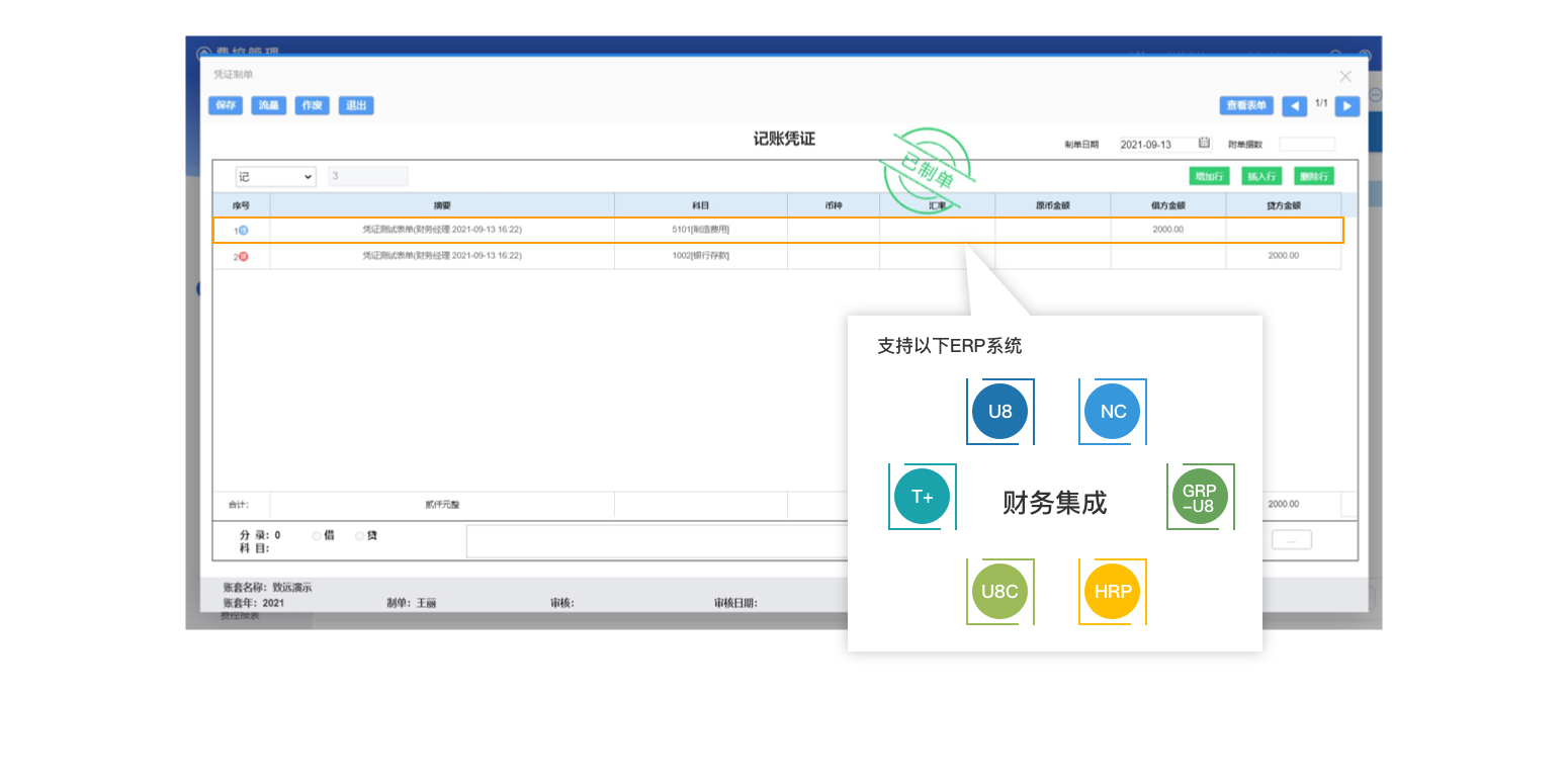 系統(tǒng)與ERP軟件(如用友NC/U8?SAP、金蝶)無縫集成,確保從審批單到憑證自動化轉(zhuǎn)換,減少憑證錄入的錯誤率。
