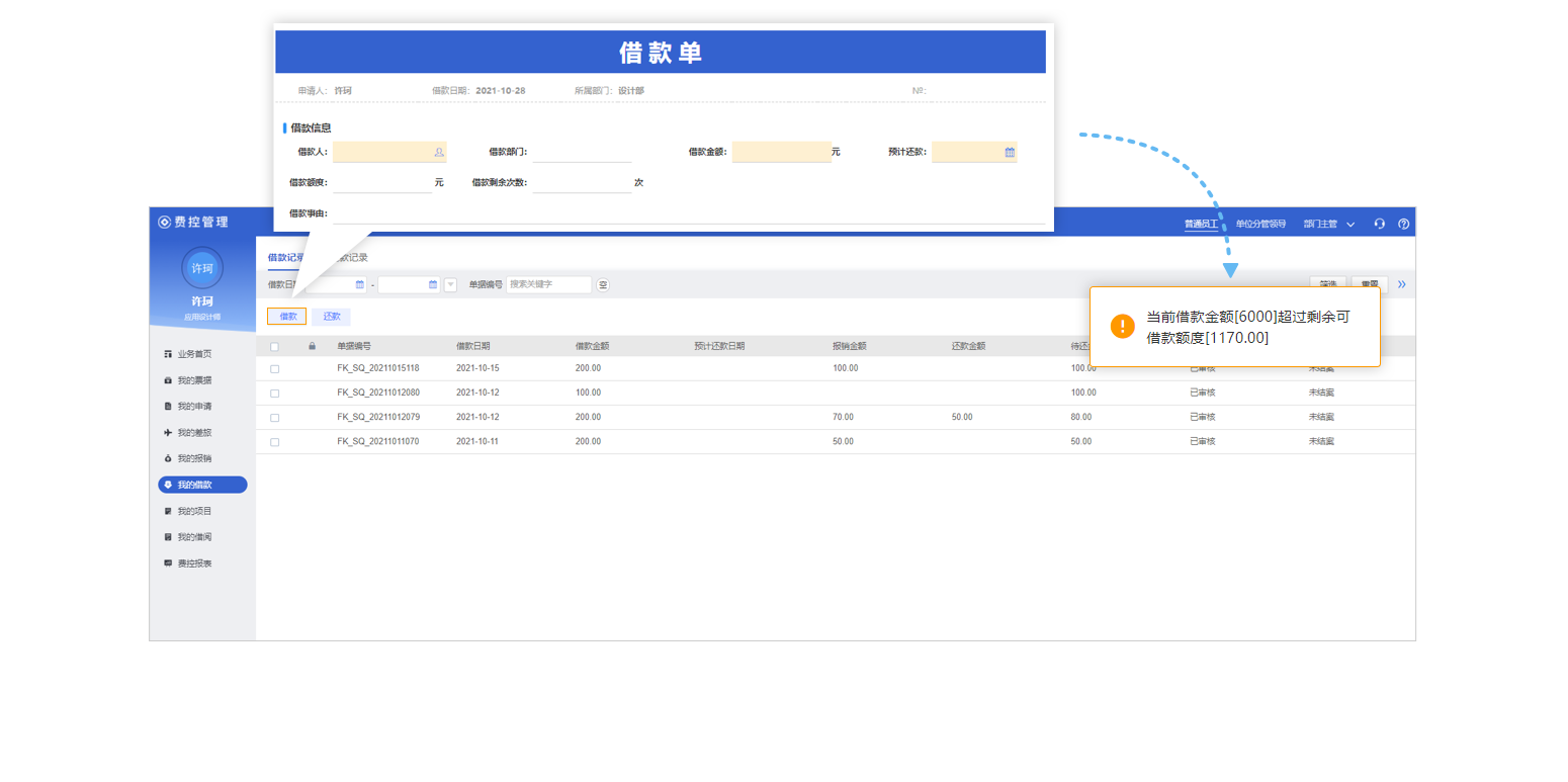 系統(tǒng)預(yù)置員工/部門借款信用管理模型(如借款次數(shù)、借款總額、借款沖抵、部門累計等,更好地支持企事業(yè)單位對員工借款的管理,直觀清晰地了解員工歷史借款、報銷、還款情況,并可及時通知員工報銷或還款,減少壞賬損失。