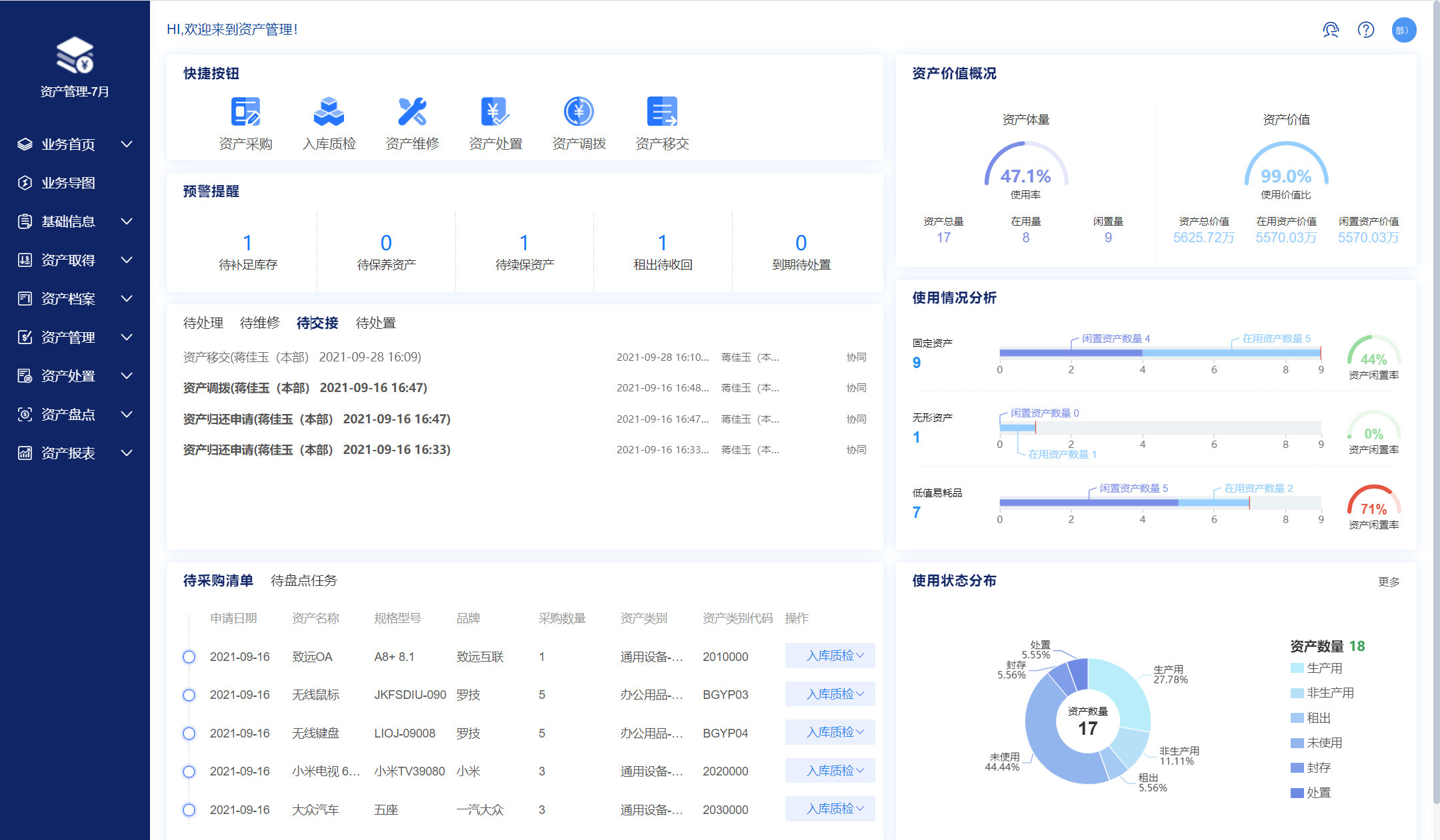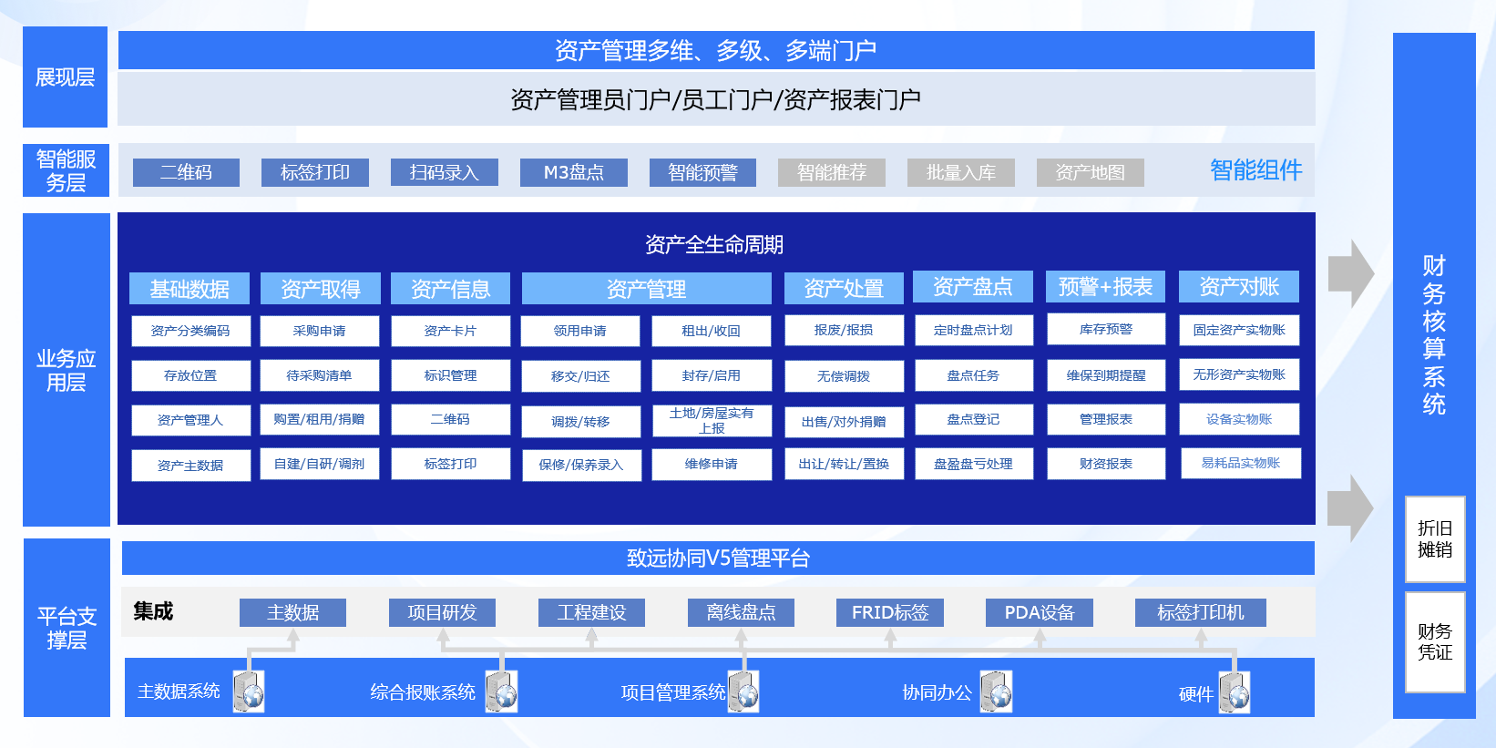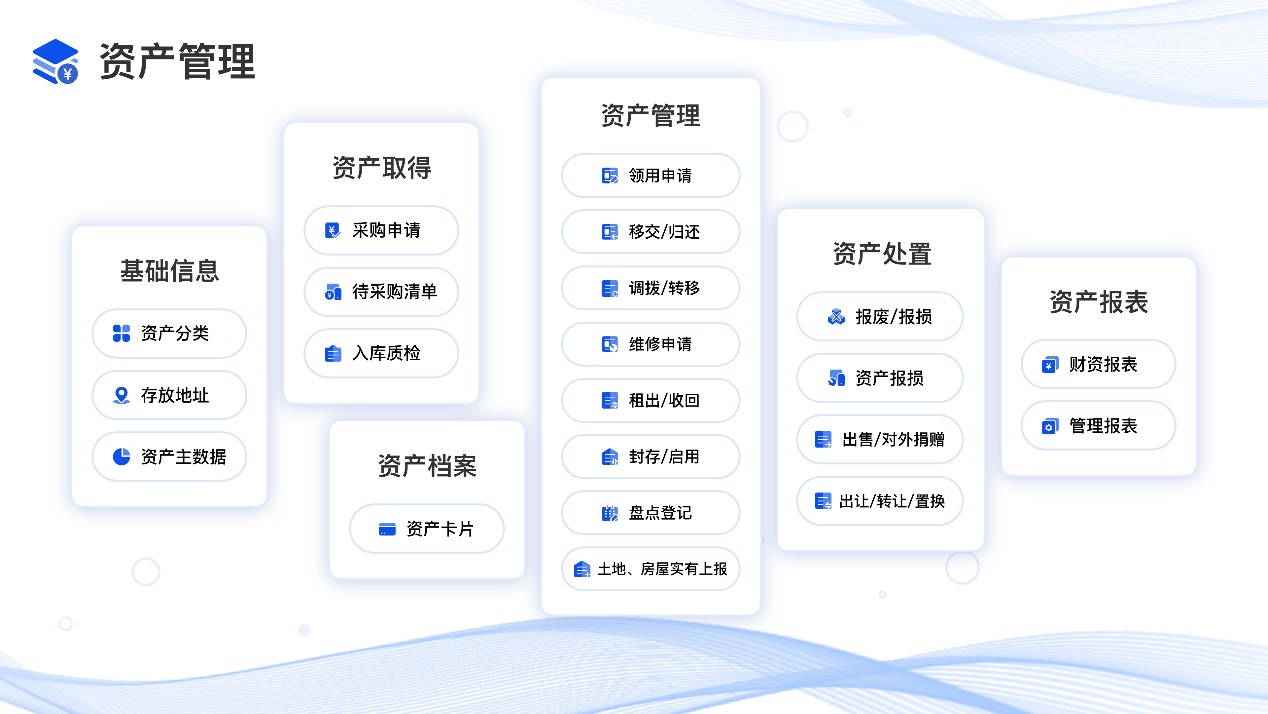 包含了對固定資產、無形資產、低值易耗品全量資產,覆蓋資產分類、存放位置、主數據等基礎信息管理,以及從資產采購、入庫、領用、調撥、移交、歸還、盤點、處置等全生命周期流轉管理。