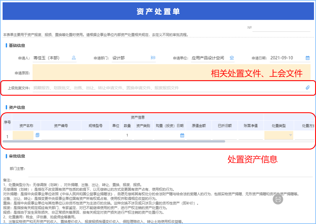 覆蓋資產退出全過程管理,處置類型包括分為無償調撥(劃轉)、對外捐贈、出售、出讓、轉讓、置換、報廢、報損。