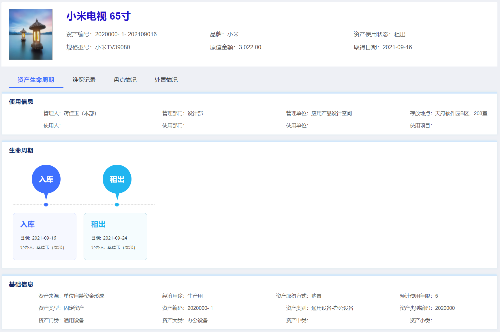 資產卡片記錄資產全生命周期,包含使用信息、存放信息、維保信息、盤點信息等。以圖形化界面展示。