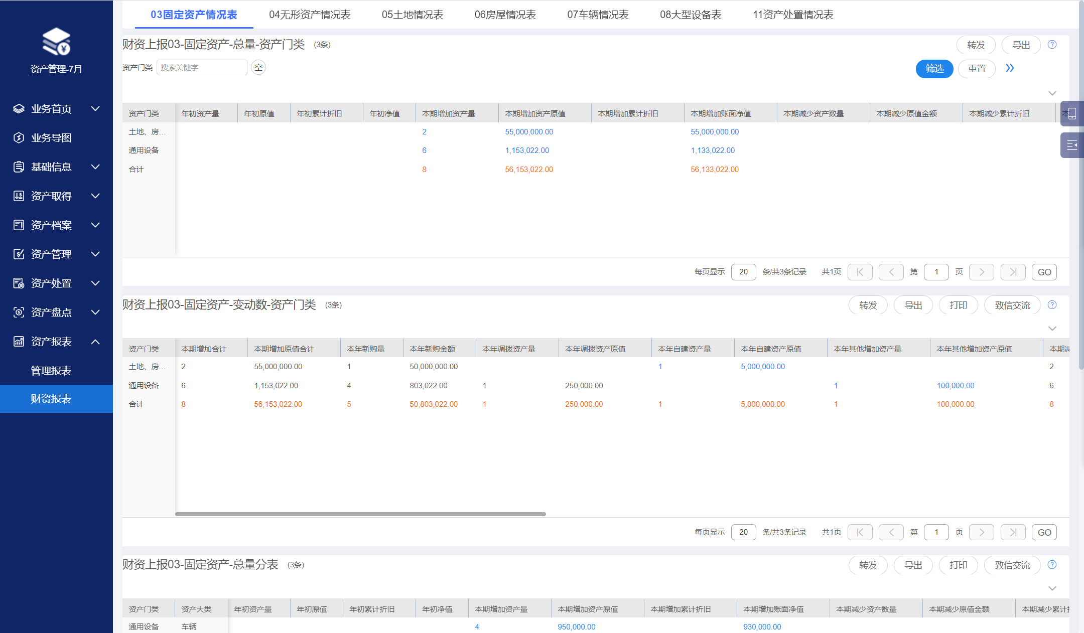 資產管理報表,以圖形化、數字化方式展現單位當前資產情況。按照財政部制定的《2017年度行政事業單位國有資產報告》格式及編制說明,設置財資報表,支持數據一鍵導出。
